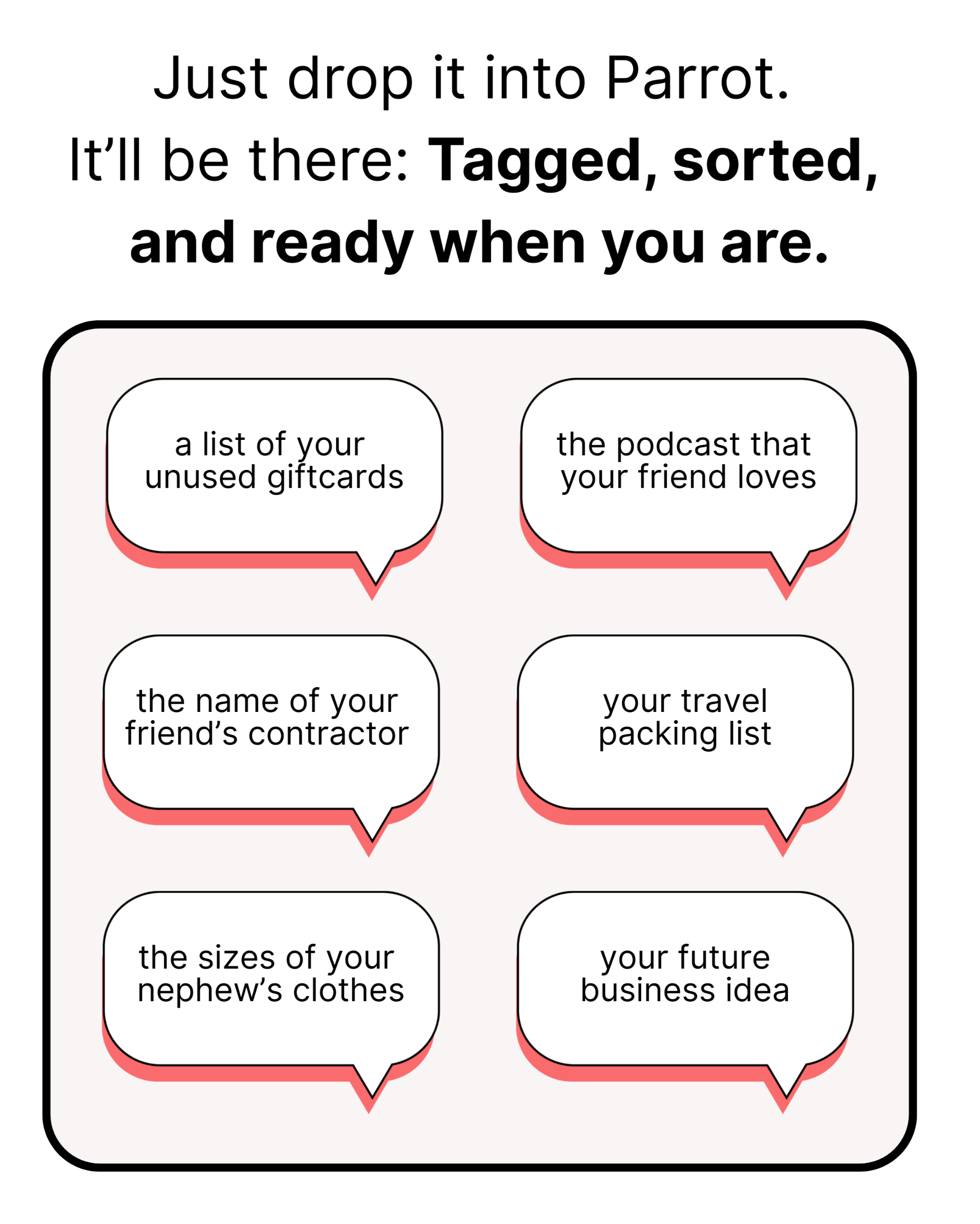 You’re constantly scribbling notes, saving links, snapping screenshots, because your brain’s busy and your memory’s flaky.Parrot organizes it all for you, so nothing important slips through the cracks.We sort it. Tag it. Surface it. Right when you need it.